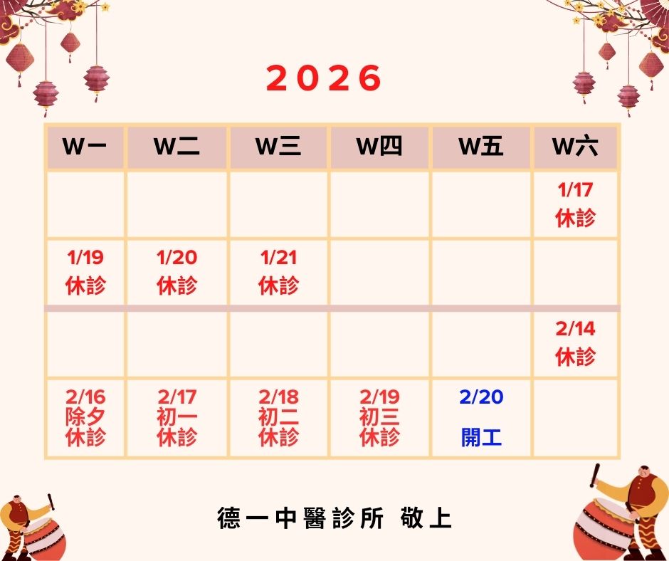 提早備藥: 請需要回診或針灸療程的病友們,務必檢查藥品存量,並盡量提早於 2 月 14 日 (六) 前完成看診。